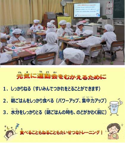 運動会が近づいてきました。給食時間の献立一口メモでも「元気に運動会をむかえる」ための3つのポイントを紹介しています。