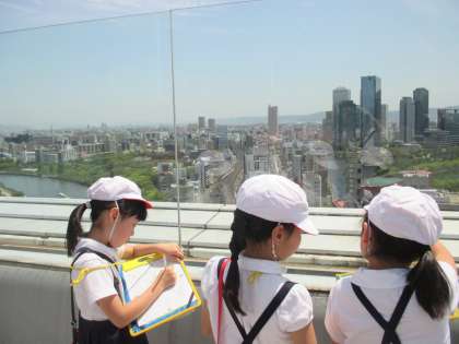 3年生は社会科で、「わたしたちのまち」について学習しています。初めに、滝川の校区について調べました。そして、さらに視野を広げ、今日は「大阪市」のようすについて、天満橋にあるOMMビルのスカイテラスから見学しました。