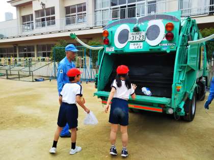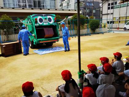 4日(火)パッカー車が小学校の運動場にやって来ました。4年生は、社会科学習の一環としてパッカー車体験とごみの分別体験をしました。パッカー車は、まずおおきな粗大ごみを細かく砕いて体積を小さくして車に収納していきます。続いて、児童が持参してきたごみを次々と収納していきます。児童は、ボタンで操作を体験しました。つづいて、運転席にも乗ってみました。3時間目は、図書室で分別について学習しました。児童は、大阪市のごみ収集の現状とごみを減らす(リデュース)、ごみを再利用(リユース)する、ごみをリサイクルするという3つのRについて学習し、今後何を気を付けていかねばならないかということに気づかされた一日でした。
