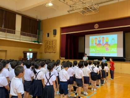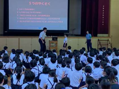 今日は、天満署の皆さんをお迎えして、低学年と高学年に分かれて生活安全教室がありました。