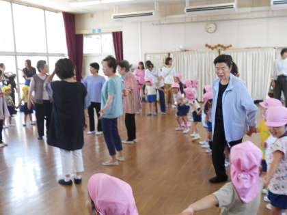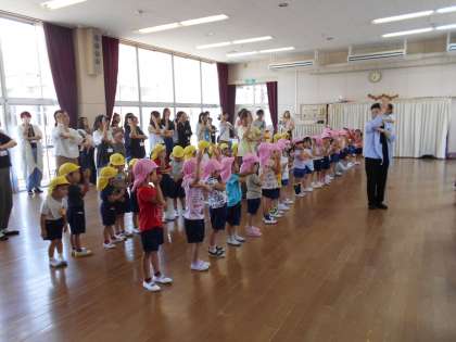 今日は、地域の方に「滝川音頭」を教えてもらいました。滝川のまちに大切に受け継がれている踊りです。たんぽぽ組・さくら組・ばら組のみなさん、とっても上手にできましたね。保護者のみなさんも多数ご参加いただき、ありがとうございました。