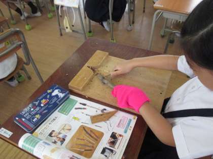 3年生は図画工作科で小刀を使いました。自然の木の枝を加工して、枝ペン(?)を制作しました! 初めて扱う小刀に、ドキドキの子どもたち。カッターナイフよりも大きな刃先に、緊張が高まりました。
