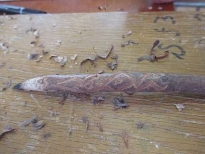 安全な刃の出し方・入れ方や、構え方などを教わった後、思い思いに枝を削って、「世界に一つだけのペン」を作りました。ペン先に、墨や絵の具をつけて絵や文字をかくことができます。ご家庭で、楽しんでみてください!