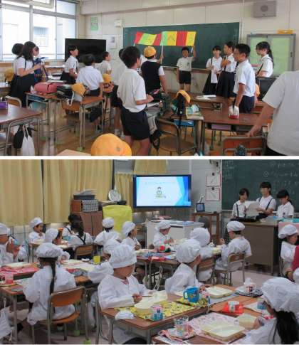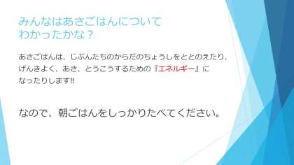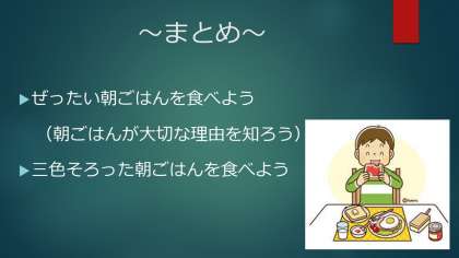 給食時間には、パワーポイントを使って各教室で朝ごはんの大切さについて説明しました。上は低学年用、下は高学年用です。