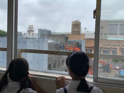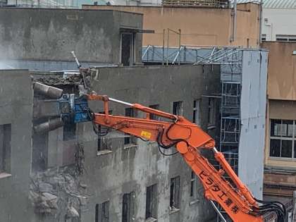 工事が進んでいます。北校舎が解体され子ども達が見守っていました。