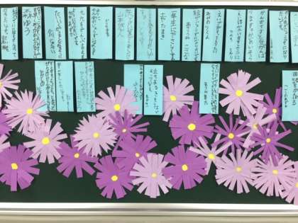 2学期が始まり、子ども達は意欲的に学習に取り組んでいます。今日は、2学期のめあてを立てました。また、画用紙を切り、コスモスを作りました。みんなが作ったコスモスとめあてを組み合わせ、にぎやかな掲示になりました。
