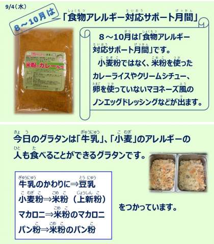 8〜10月は食物アレルギー対応サポート月間です。マヨネーズの代わりに卵不使用のマヨネーズタイプのドレッシングや小麦粉の代わりに米粉を使ったカレールウなどを使っています。