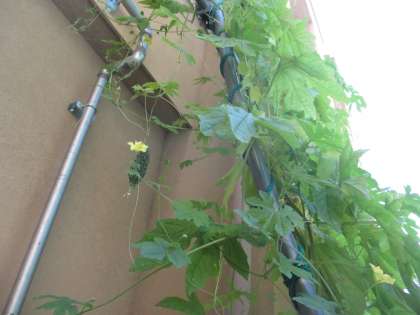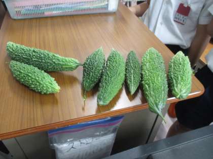 暑い日が続いています。その中で春に植えたゴーヤが実をつけだしました。毎日、収穫されています。出席番号順に、持って帰っています。