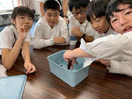 ザリガニのオスとメスを触って観察しています。