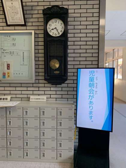 玄関に電光掲示板を設置しました。朝の予定や案内で活用します。