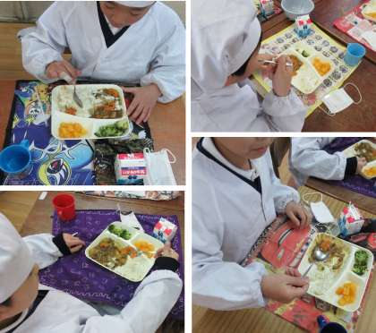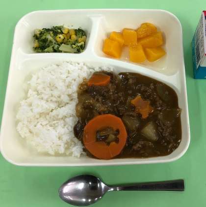今日の献立は「冬野菜のカレーライス、牛乳、ブロッコリーとコーンのサラダ、黄桃(カット缶)」でした。