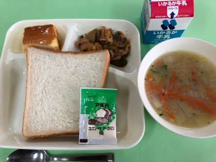 2学期最後の給食は「食パン、マーガリン、牛乳、豚肉のケチャップソテー、コーンスープ、焼きプリン」でした。