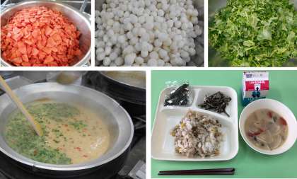 今日の献立は「れんこんのちらしずし、牛乳、ぞう煮、ごまめ」でした。ぞう煮はかつおぶしでだしをとり、関西風の白みそ多めの味つけにしています。なにわの伝統野菜のきんときにんじん、みつばなどが入り、いろどりもきれいに仕上がっていました。