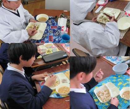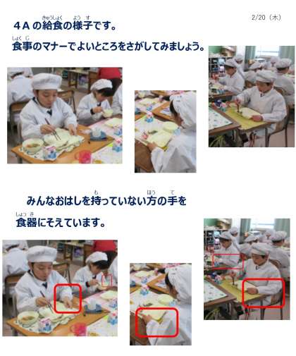 今日の献立一口メモは4年生の給食の様子から食事のマナーでよいところを探してみようというものでした。