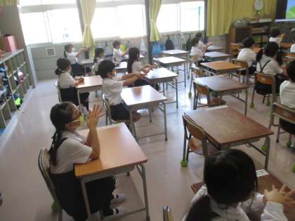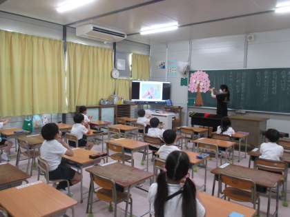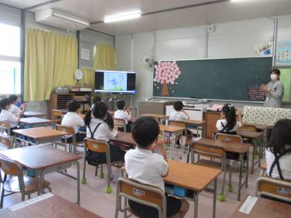 来週から、分散登校ではありますが、通常授業が始まります。また、給食も始まります。1年生は、手洗いの仕方を大型モニターで見ました。そして、歌に合わせて、教室でエア手洗いをし、後に実際に手洗いを行いました。来週の給食が楽しみです。