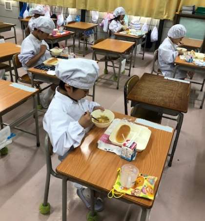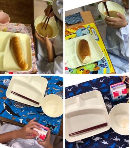 今日の給食は「コッペパン、牛乳、みそ汁」でした。1年生も上手にお箸で食べていて、ピカピカお皿の人もたくさんいました。