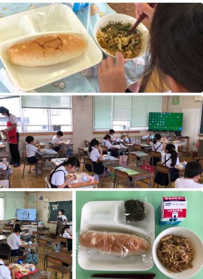 短縮授業最終日の給食は「おさつパン、牛乳、焼きそば」でした。炒め麺の日は小さいパンがつくのですが、今日は通常サイズ。ちょっと量が多かった人もいたようでした。