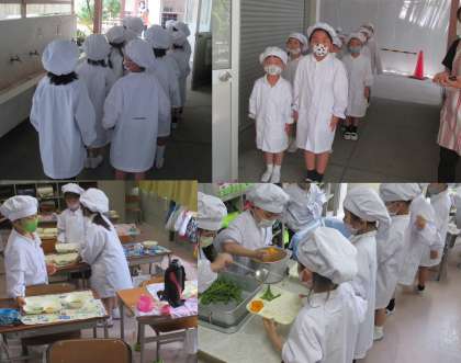 1年生の給食時間の様子です。給食当番の仕事もずいぶん上手にできるようになってきました。