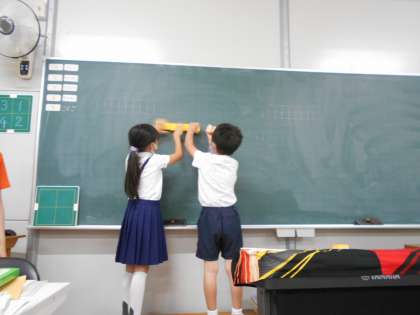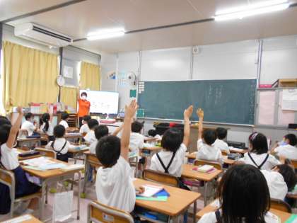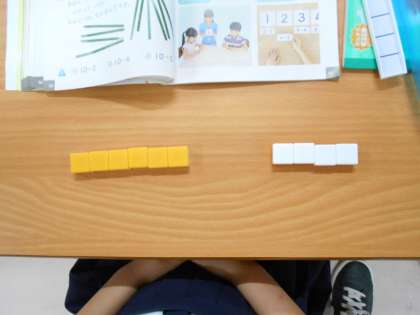 本年度から新学習指導要領の下、評価についても大きな変化がありました。通知表を含めた学習評価については、27日(月)配布の資料をごらんください。本年度から各教科の観点がどの教科も3つになりました。課題を解決するための思考力や表現力が求められています。1年生の算数科の観点「思考力・判断力・表現力等」は、「ものの数に着目し、具体物や図などを用いて数の数え方や計算のしかたを考える」ことがあげられています。今日は「ひきざん」の学習です。問題文から、題意をつかみ、数を確認し何を求めるのか、絵を使わず式で表すとどうなるのか、それをどう説明するのか、ブロックで説明することができるのか、先生の問いに児童はたくさん手を挙げて発表します。そして、自分の言葉で、みんなに向かって説明をします。新学習指導要領においては「主体的・対話的で深い学び」の視点が重要視されています。自分が考えたことを伝えあうこと、友だちの考えと自分の考えを比べて、算数的な良さを見つけていくこと、そんなこともねらいのひとつです。今日は、児童は、自分の言葉でしっかり説明することができ、説明したいと多くの児童の手が挙がりました。ブロックを使って、「10−4」を説明することができました。