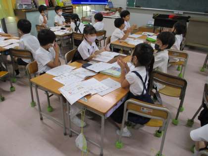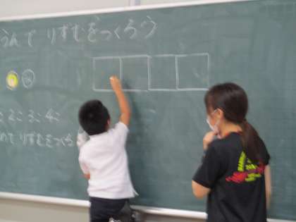 今日は、リズムうちの勉強をしました。先生のリズムや友だちの考えたリズムをまねするまねっこ遊び、きれめなくったくリレー遊びなどをしました。自分の考えたリズムを発表したり、グループに伝えたりしたことがとても楽しかったです。