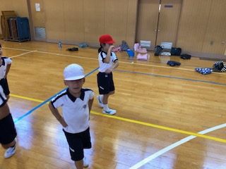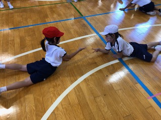 体育の時間には、いろいろな動物になりきって歩き回り、出会った友達とじゃんけんをするゲームをしました。