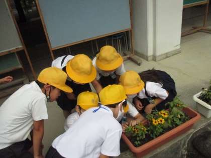 玄関前のプランターで。「先生、シジミチョウが、たまごうんでる!!!」と、集まった子どもたちは大興奮!!