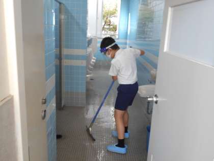 金曜日のトイレ掃除は、フェイスガードをして水を使って掃除をします。(通常は、水を使いません。)6年生は、少人数できちんと掃除をしてくれます。