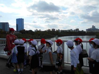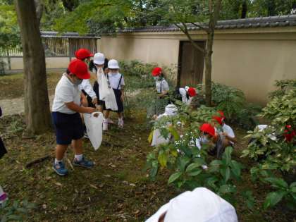 素晴らしい秋晴れの下、「あきみつけ」にでかけました。藤田公園まで、並んでいきました。橋の上から大阪城が見え、みんな歓声を上げました。藤田公園では、どんぐりをたくさん拾いました。