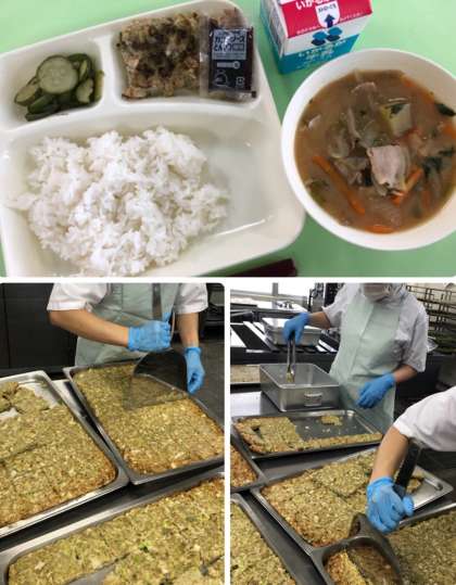 小さい四角形のお好み焼きは給食ならでは。やまいもとろろや粉末のかつおぶし、あおのりなどを生地に加えおいしく焼き上がる工夫をしています。