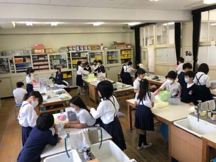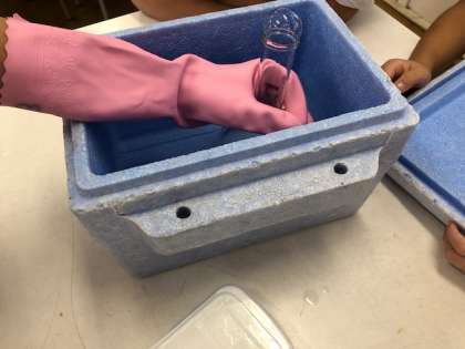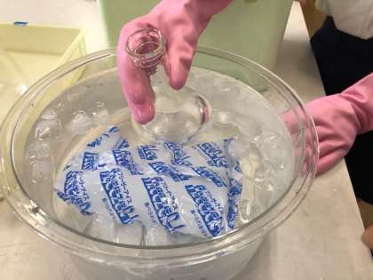 丸底フラスコの口に張った膜が、空気を温めると膨らみ、冷やすとフラスコの中に下がって生きんした。その様子が、子どたちの予想以上だったようで、何度も膜を張っては、温めたり冷やしたりを繰り返していました。その体験を通して、空気の体積の変化を学ぶことができました。