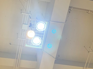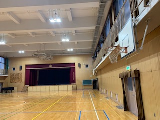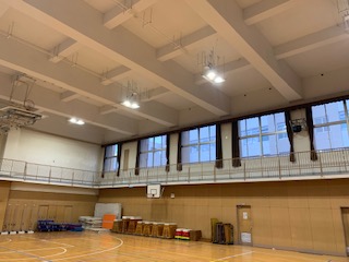 講堂の照明がLEDになり講堂が輝いています。明るい照明になりました。すぐに電気もついたりけしたりできるようになりました。
