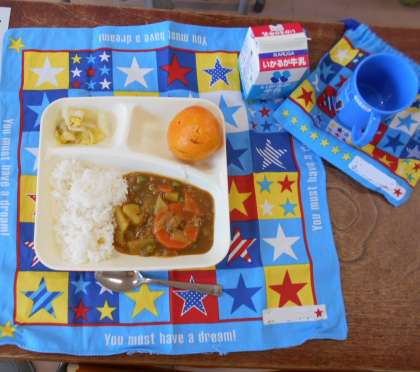 今日の献立は「ポークカレーライス[米粉]、牛乳、はくさいのピクルス、みかん」でした。