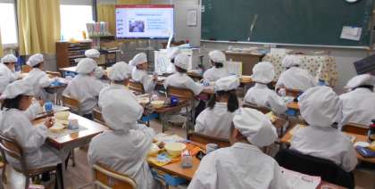 給食時間に毎日見ている一口メモ。今日はいろんなクラスががんばっているところを紹介する内容でした。