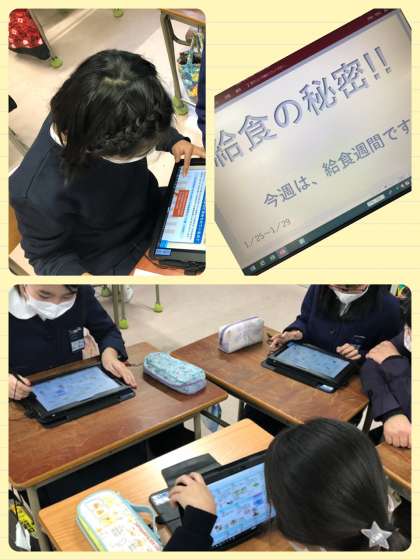 タブレットで給食週間の由来、献立の立て方などを調べてまとめています。