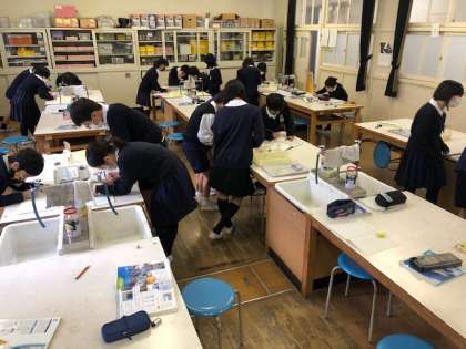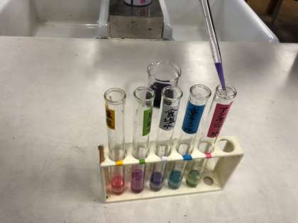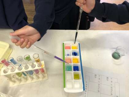 水溶液として、レモン果汁や酢、石鹸水など身近なものの性質も調べました。アルカリ性や酸性などの性質によって色が変わる様子を観察することができました。色が鮮やかに変わっていく様子を見て、驚きの声も上がっていました。