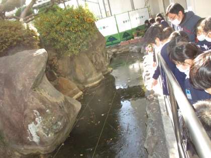 元気な子どもたちの声に池を見ると、池の表面がラップを張ったように凍っていました!