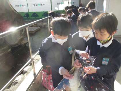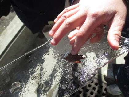 割って、かけらを手渡すと、「ひゃ〜、つめたい!!」「自然の氷、初めてさわった!!」と、大興奮! 日かげの氷が分厚いことに気づいた子どもたち。「なんでやと思う?」とたずねてみると・・・「あっ! 日なたより、気温が低いからや!」「日光が当たらへんからやんなぁ?」と、理科で教わった知識とつながったようです。