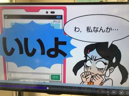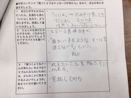 学級活動の時間に、動画教材「傷つくようなメッセージが友達から来たら」を通して、メールの使い方について考えました。メールは本意とは違う形で伝わってしまうことがあることを知り、困ったことがあれば相談することの大切さに気付くことができました。