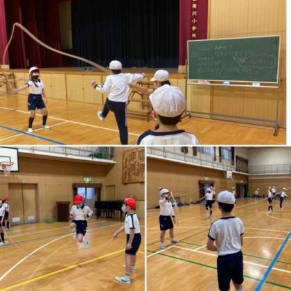 かけ足跳び、2拍子跳び、前振りとびをしました。