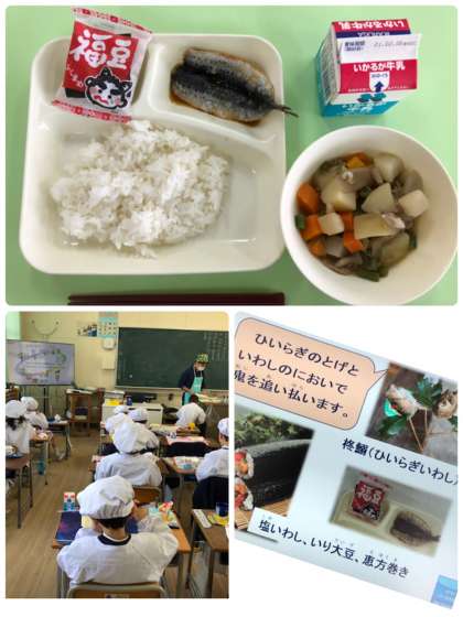 今日の献立は、節分の行事献立「ご飯、牛乳、いわしのしょうがじょうゆかけ、含め煮、いり大豆」でした。