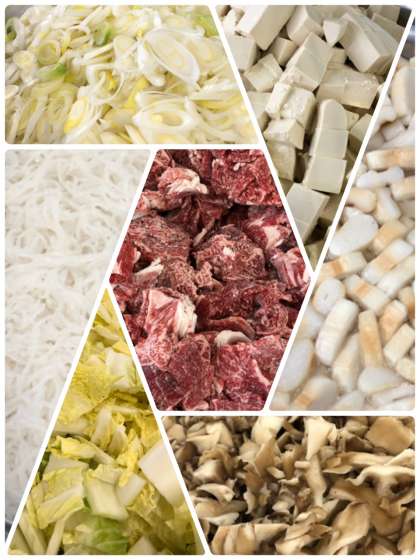 1枚目の写真はすき焼き煮の材料です。真ん中は近江牛。外側の左上から時計回りに白ねぎ、とうふ、ふ、まいたけ、はくさい、糸こんにゃくです。