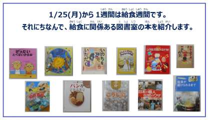 先月の給食週間中、図書室に展示していた給食や食にちなんだ本を「食・はぐくみ通信9号」(配布文書>食育・給食)に紹介しています。