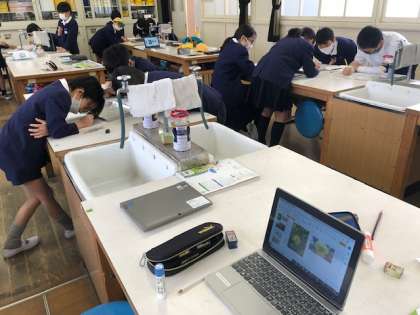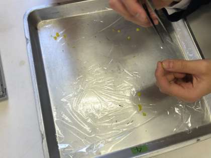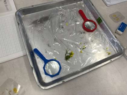 理科では、アブラナの花のつくりを勉強しました。花のどの部分が、実になるのか。予想をしてから、実際に学習園に咲いていた花を摘みに行きました。積んだ花を、ピンセットで慎重に分解しながら、実のできる場所はどこなのかを探しました。
