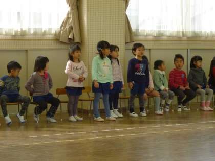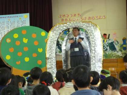 生活発表会「白雪姫」の大道具、魔法の鏡を使って「まねっこ遊び」。園長先生と同じポーズができるかな?司会は4歳児さくら組ががんばりましたよ!
