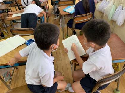 隣の友だちにノートを見せながら、図を指し示して話すなど、