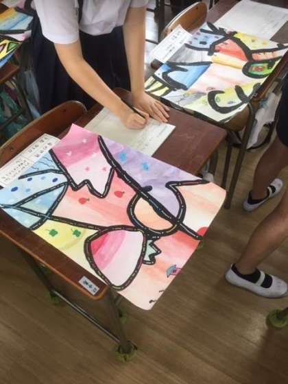 図工の時間に、自分の名前をモチーフにした作品「名前でアート」を描きました。