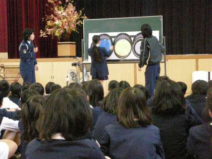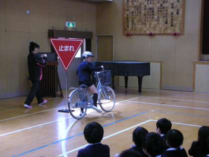 雨で運動場が使えないので、講堂で交通安全指導を行いました。運動場で実施の場合は、全員に自転車に乗ってもらえたのですが、講堂ですので、代表のみの乗車となりました。それでもみんな熱心に話を聞き、府警の方もわかりやすく教えていただきました。