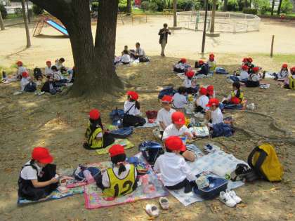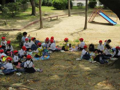 近くの公園に移動してみんなでお弁当を食べました。すぐ横に遊具もあるので、みんな楽しく遊びました。お弁当とおやつを食べるのに1時間以上かかる児童もいましたが、青空の下、みんなで食べるお弁当はおいしかったです。帰りはさすがに疲れていましたが、2年生はしっかり1年生をリードしました。1年生は電車でのマナーや海遊館でのマナーがとても良かったです。大満足の遠足でした。