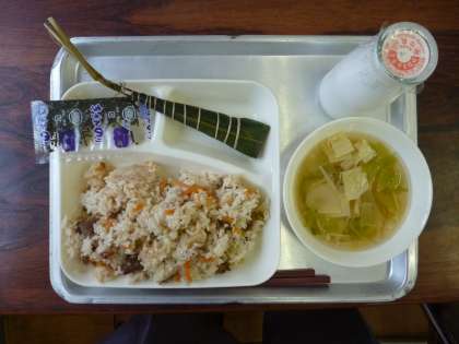 今日の給食の献立は、子どもの日の行事献立で、牛肉ちらしずし、五目汁、ちまきでした。ちまきは毎年、この時期に登場します。おいしくいただきました。明日から、5連休です。体調管理には十分気をつけて、連休をお過ごしください。