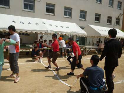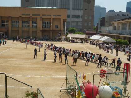 今回から新しく競技に加わったのが、借り物競争。トラック内にはアフロのヘアーをかぶった人やげいにんに扮装した人、縄跳びをする人などがいて、競争を盛り上げました。